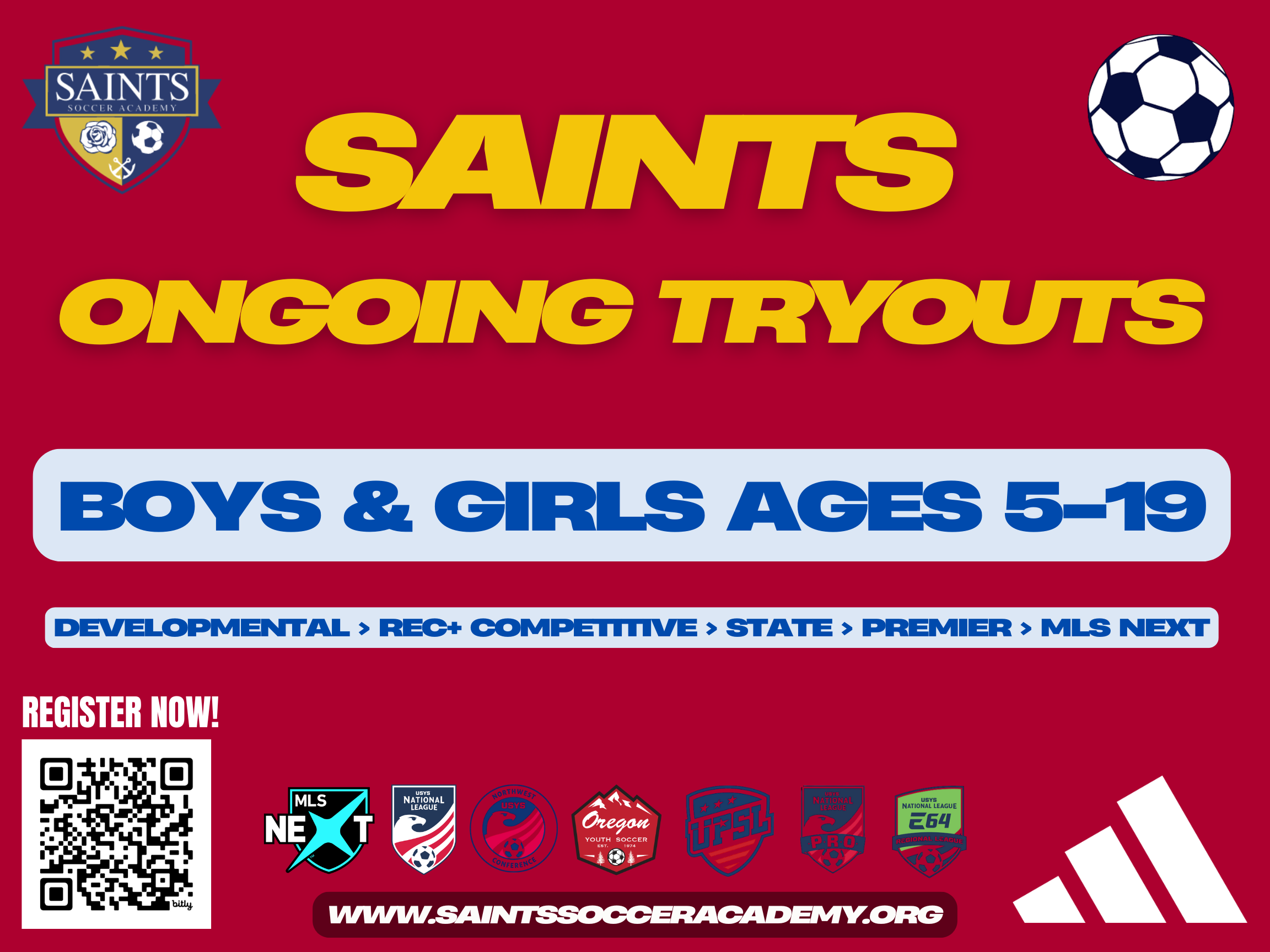 We are still holding Ongoing Tryouts through the Fall and Winter. All players finishing a Rec or High School season are encouraged to register now! Please sign up through THIS LINK, or through the menu above now. All Boys & Girls age 5-19 are welcome! Once you register, our Coaches or Age Group Coordinators will reach out to you to schedule a date and time for you to come train with an age and skill appropriate team to see if there’s a good fit. We truly believe in #SoccerForAll and are an all-inclusive soccer club. We live & breathe #AuthenticPlayerDevelopment and are excited to work with players of all skill levels. #SaintsSoccer #Community